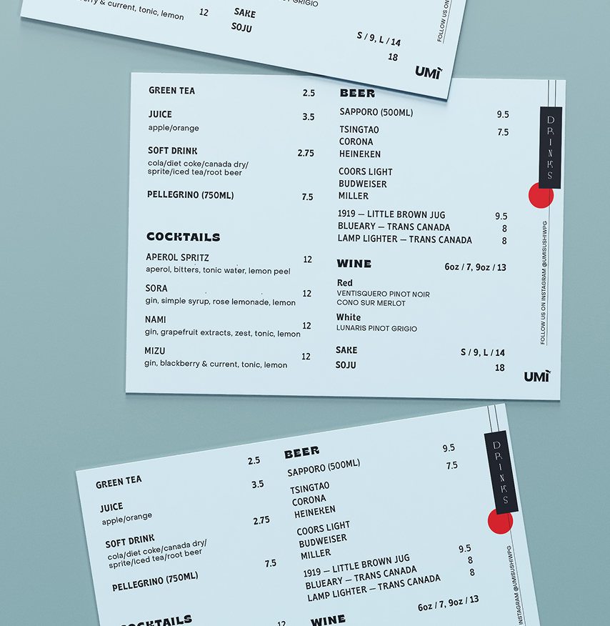 Rebranding an iconic neighbourhood sushi restaurant with a fun, youthful identity rooted in the theme of umi (海; “the sea” in Japanese). As a long-time local favourite, the restaurant needed a refreshed brand system—menus, cards, website and touchpoints—that better matched its current clientele. The new direction embraces bold ocean-inspired blues, playful phrases, and sticker-style illustrations influenced by Japanese culture, creating a modern, energetic feel that reconnects the brand with its community.